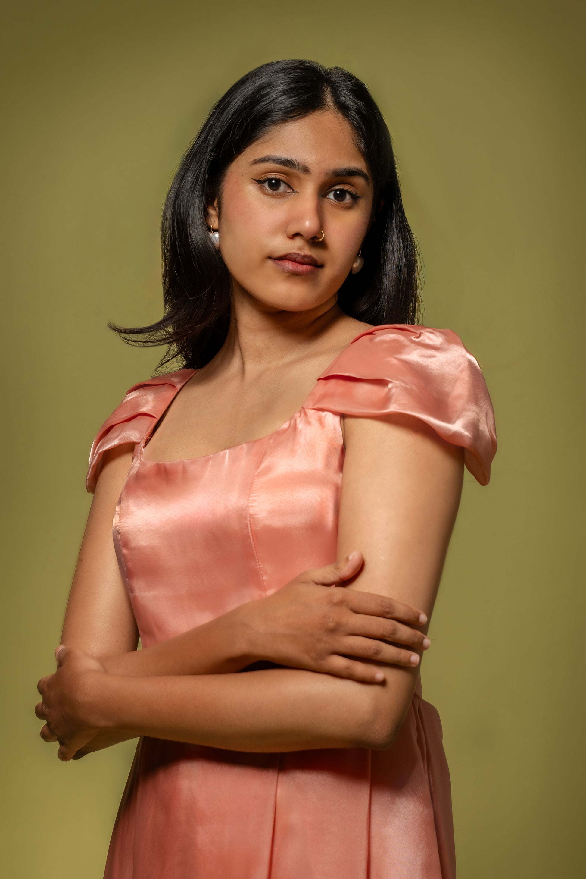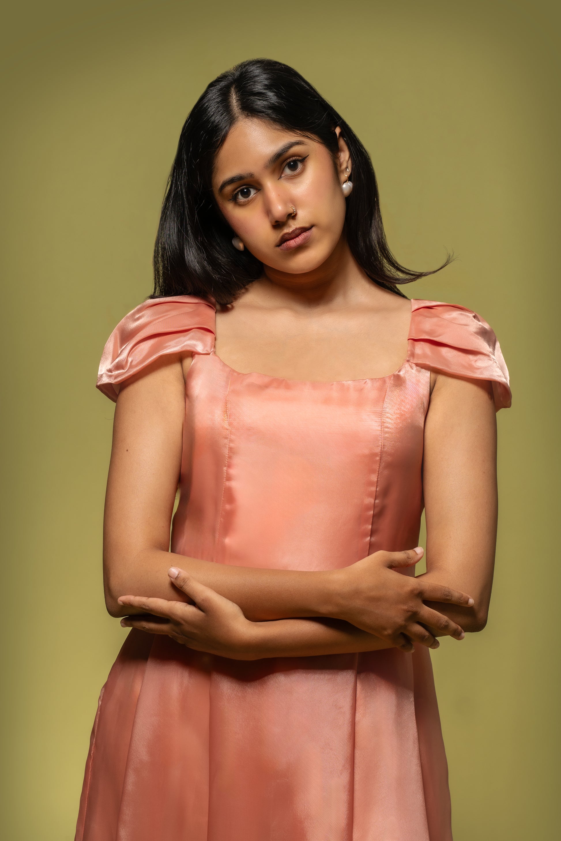 - Soft pleated A-line skirt in a beautiful peach-puff hue.