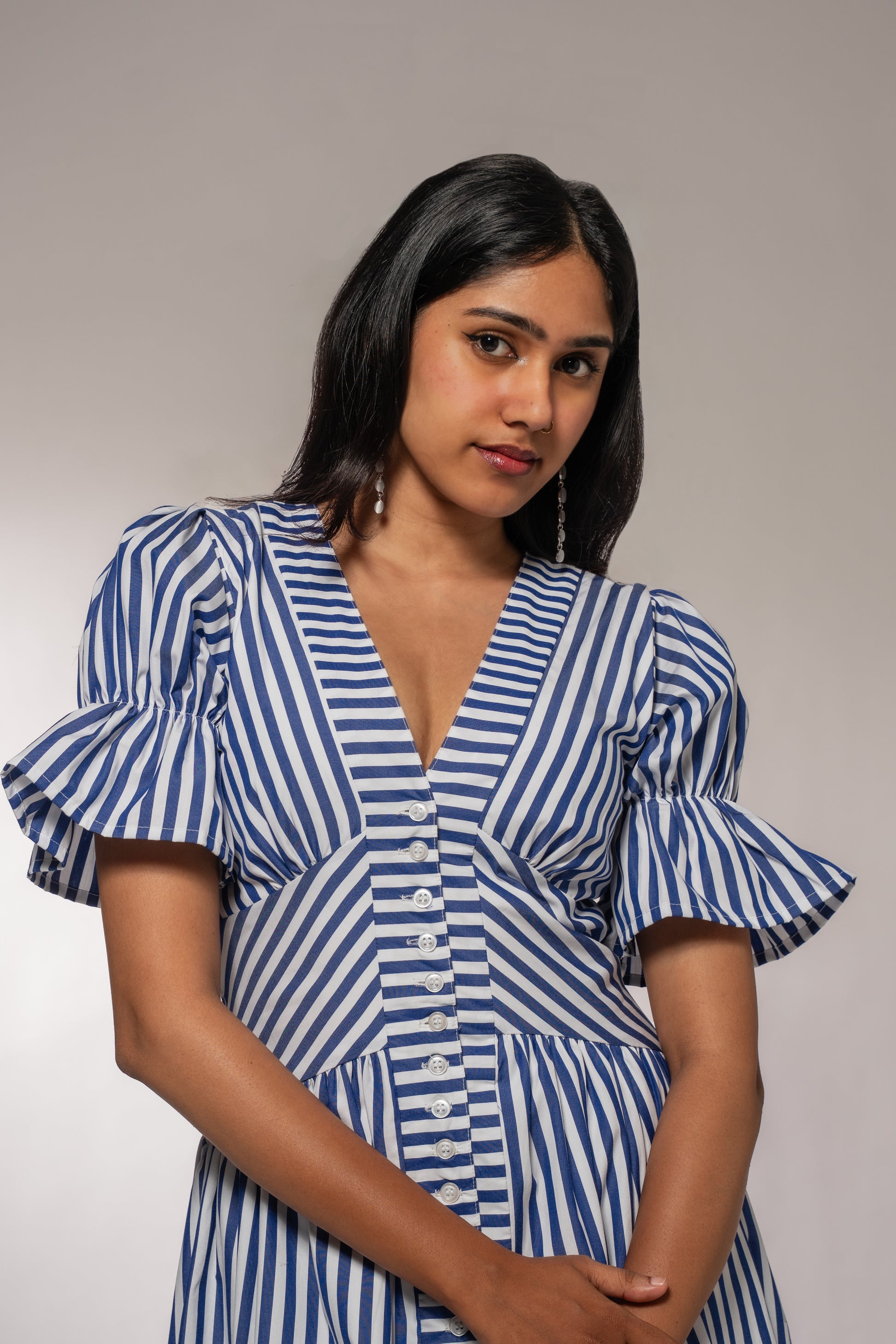 - Flattering deep V-neckline with a tailored bodice.