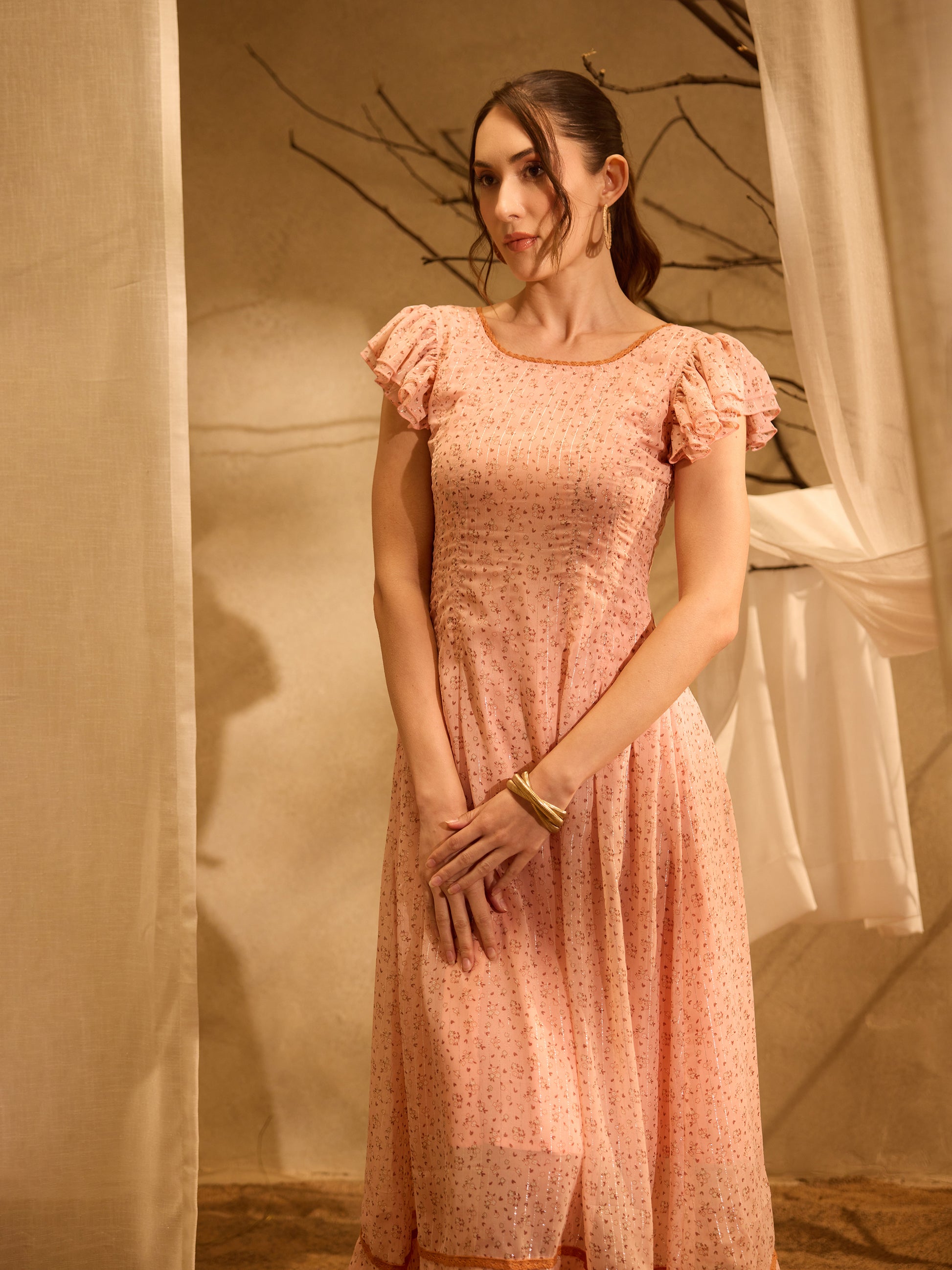 Feminine and graceful, the Peach Ruffle Sleeve Lace-Up Dress by House of Valere is crafted from airy georgette with a soft cotton lining for all-day comfort. Designed with delicate ruffle sleeves and a lace-up detail, this dress features a relaxed, flowing silhouette that moves beautifully. Perfect for warm days, brunches, and casual gatherings, it delivers effortless elegance with a soft, romantic touch.