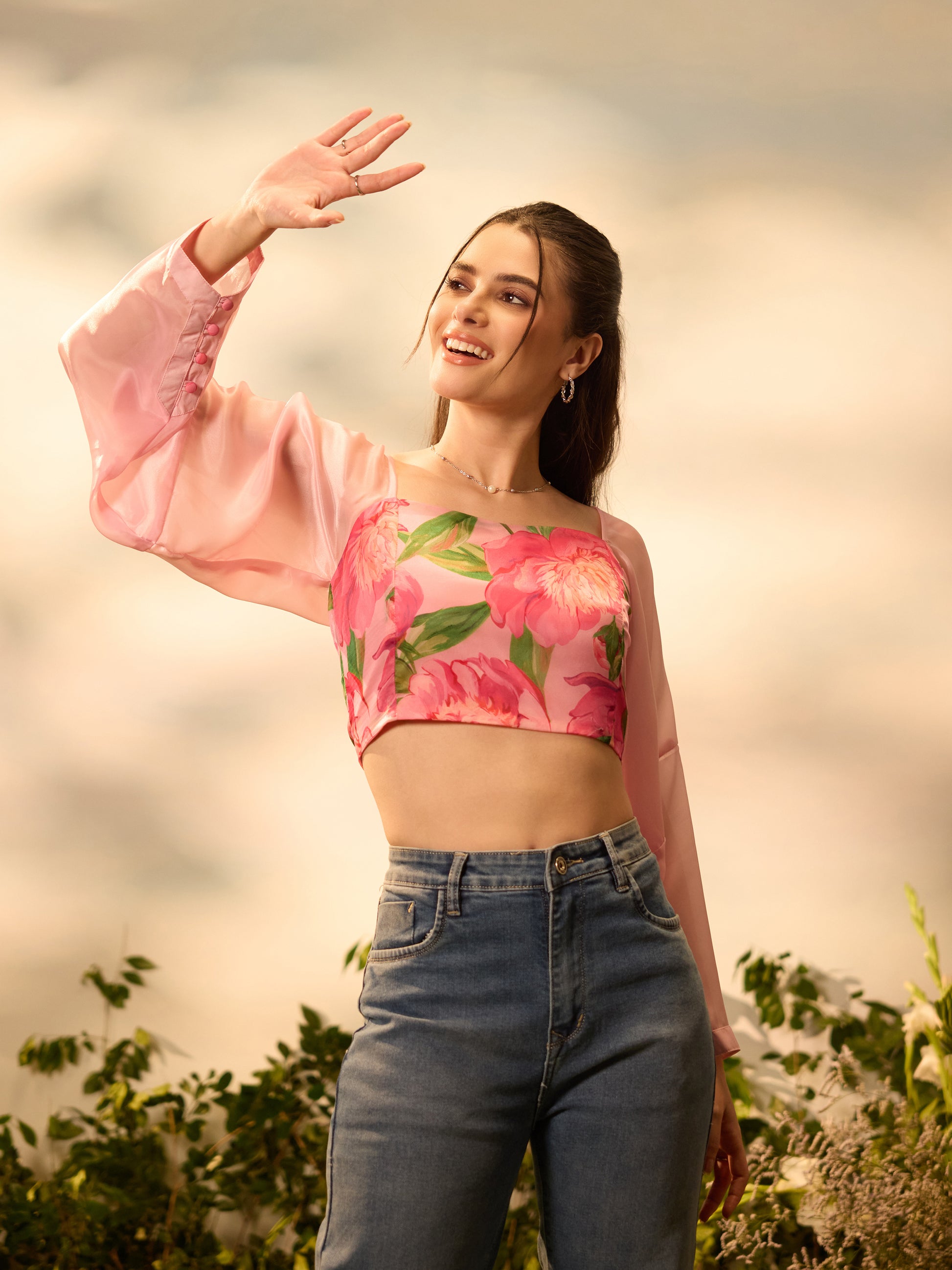 Delicate and romantic, the Peony Whisper Tie-Back Crop Top by House of Valere is crafted from sheer crystal silk organza with a soft, cotton-lined bodice for added comfort. Featuring a graceful floral print, airy sleeves, and an elegant adjustable tie-back, this piece blends modern charm with timeless femininity. Perfect for brunches, day outings, and effortless chic styling.