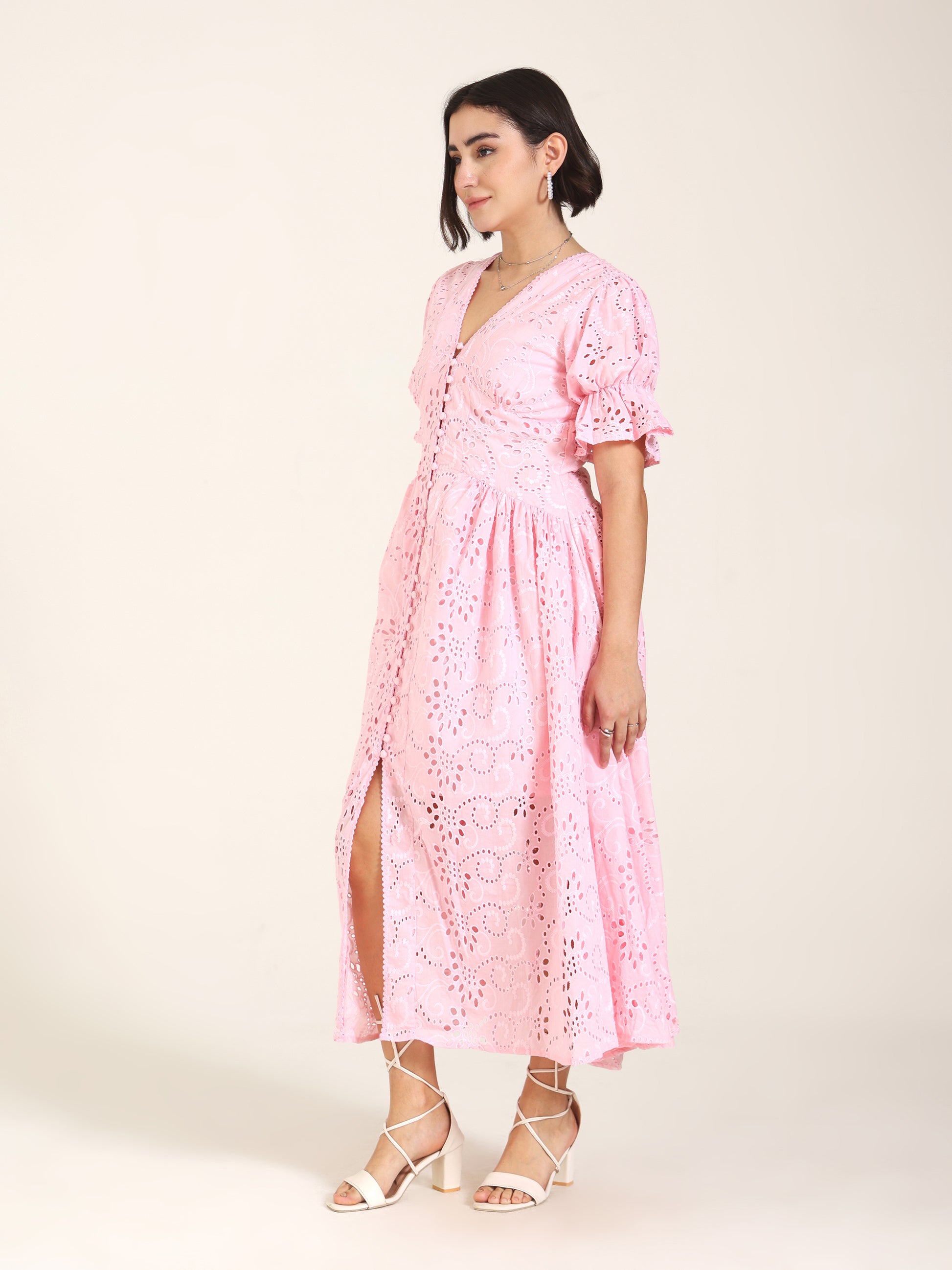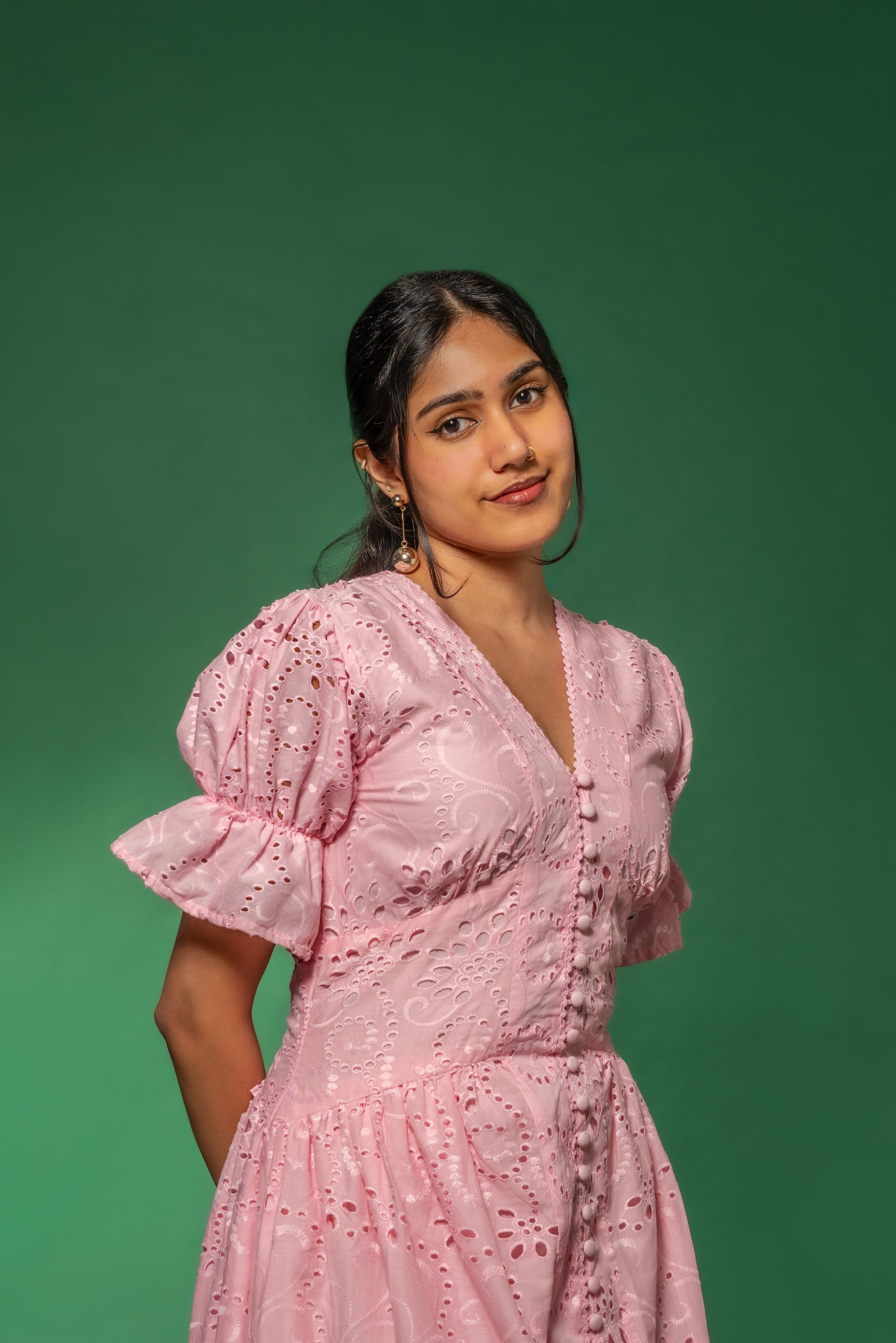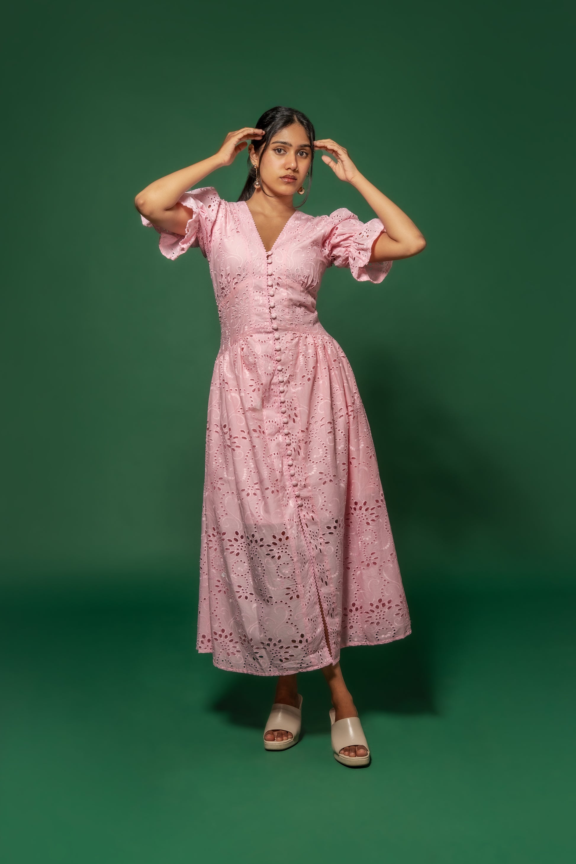 - Delicate eyelet embroidery with floral cutwork throughout.